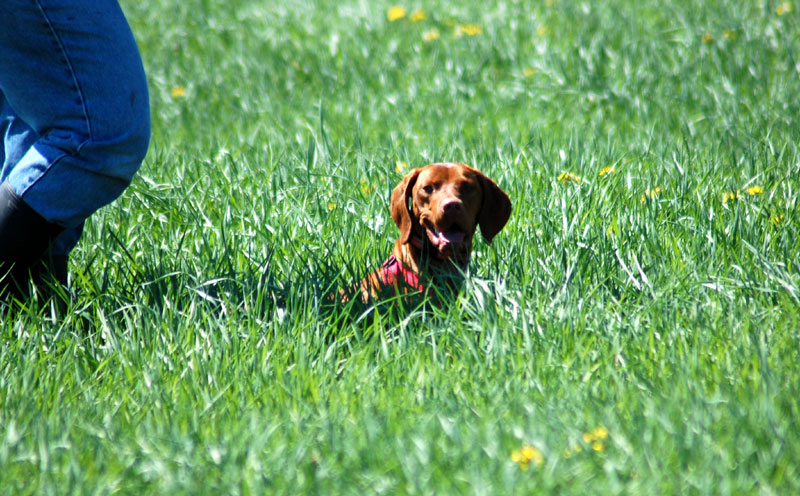 Tracking is a team effort, probably more than any other activity you and your Vizsla can get involved in. Without teamwork and confidence in your dog, you will be lost forever in the field. Your Vizsla needs to be able to find and follow the track but you need to be able to read what your Vizsla will tell you: how he indicates he has lost the track and how he indicates when he is back on it. Imagine yourself blind in the middle of the field and you need to go back to your starting point guided by your Vizsla. That is the feeling you will have when you will follow your first “blind” track. Tracking is a sport that needs to be discovered for the camaraderie you will find but most of all, because your Vizsla will love it. Here is an example of what a TDX track could look. It is Willow's track to earn his TDX.